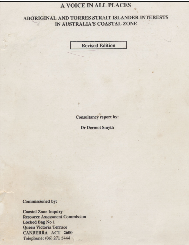 Smyth, D. (1993) A VOICE IN ALL PLACES: Aboriginal and Torres Strait Islander Interests in Australia’s Coastal Zone (revised edition). Consultancy Report, Resource Assessment Commission, Canberra. Click here to download